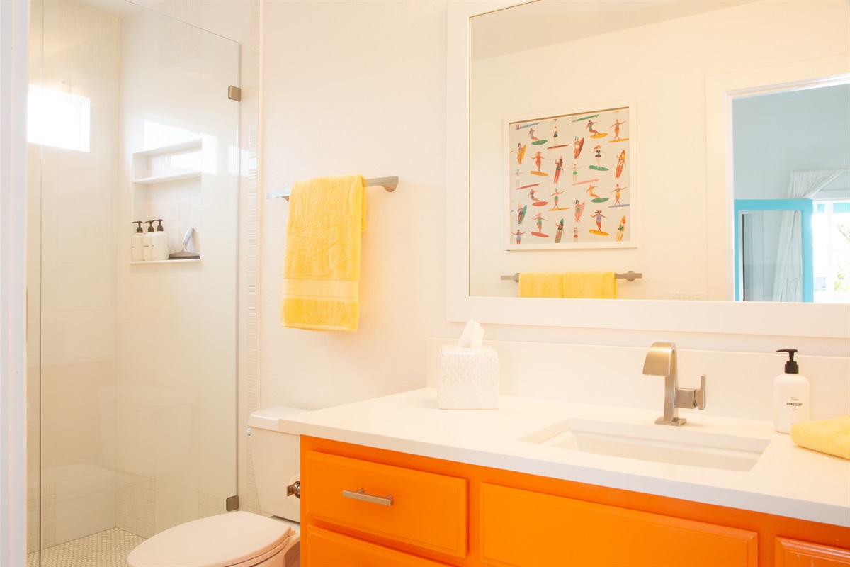 Slide open extra wide glass doors to an ocean view sunset or walk out past a BBQ porch area to sit on a sunny lawn enveloped by verdant gardens. Inside, eclectic furnishings mingle with funky pops of color creating a patina of whimsy within this family-friendly home. Walk to Moonlight Beach for a full-service beach or Swamis for some raw'n'real surfing. Or head to shopping and cafes in town, just 3 blocks away. With 9 beds and 4 outdoor areas, it provides the perfect mix of shared spaces and space to breathe. If your group expands, consider renting the back Ocean Oasis apartment as well. If not, your arrangement will still be quite private!
